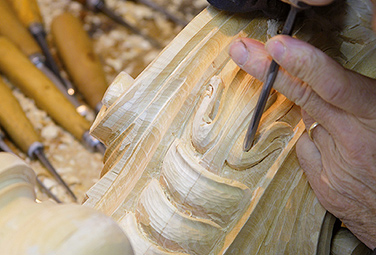 從前期需求溝通、方案設(shè)計(jì)、細(xì)節(jié)深化、面料搭配、到一比一臨摹放樣、花型放樣雕刻、木皮拼花嵌貝鑲銅、漆色對(duì)比噴涂、