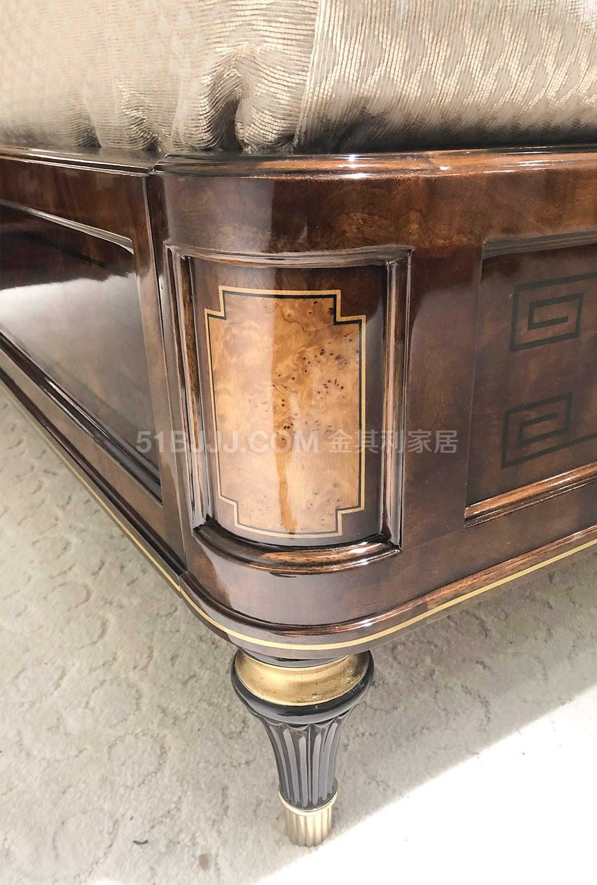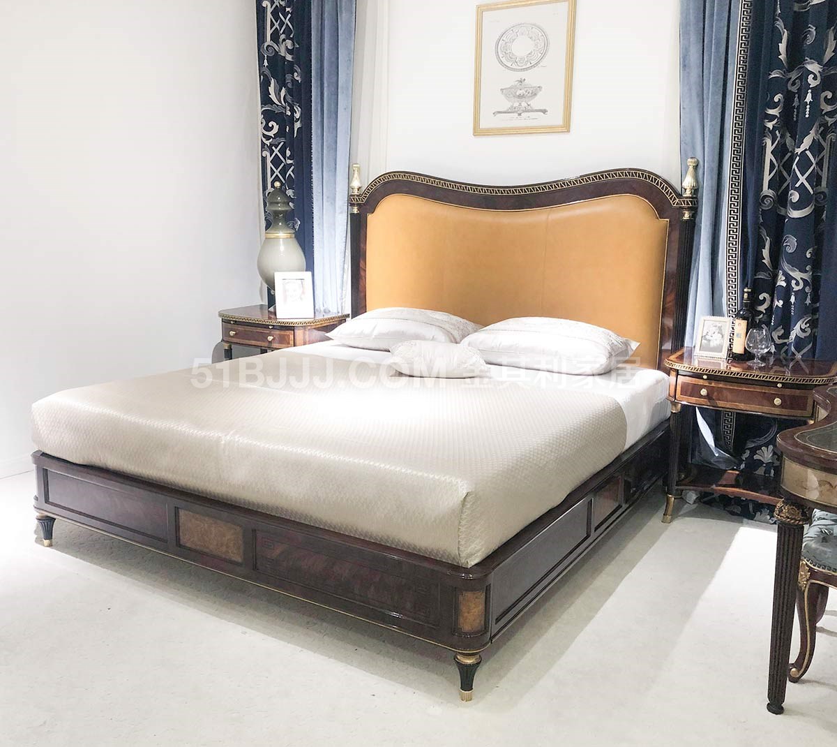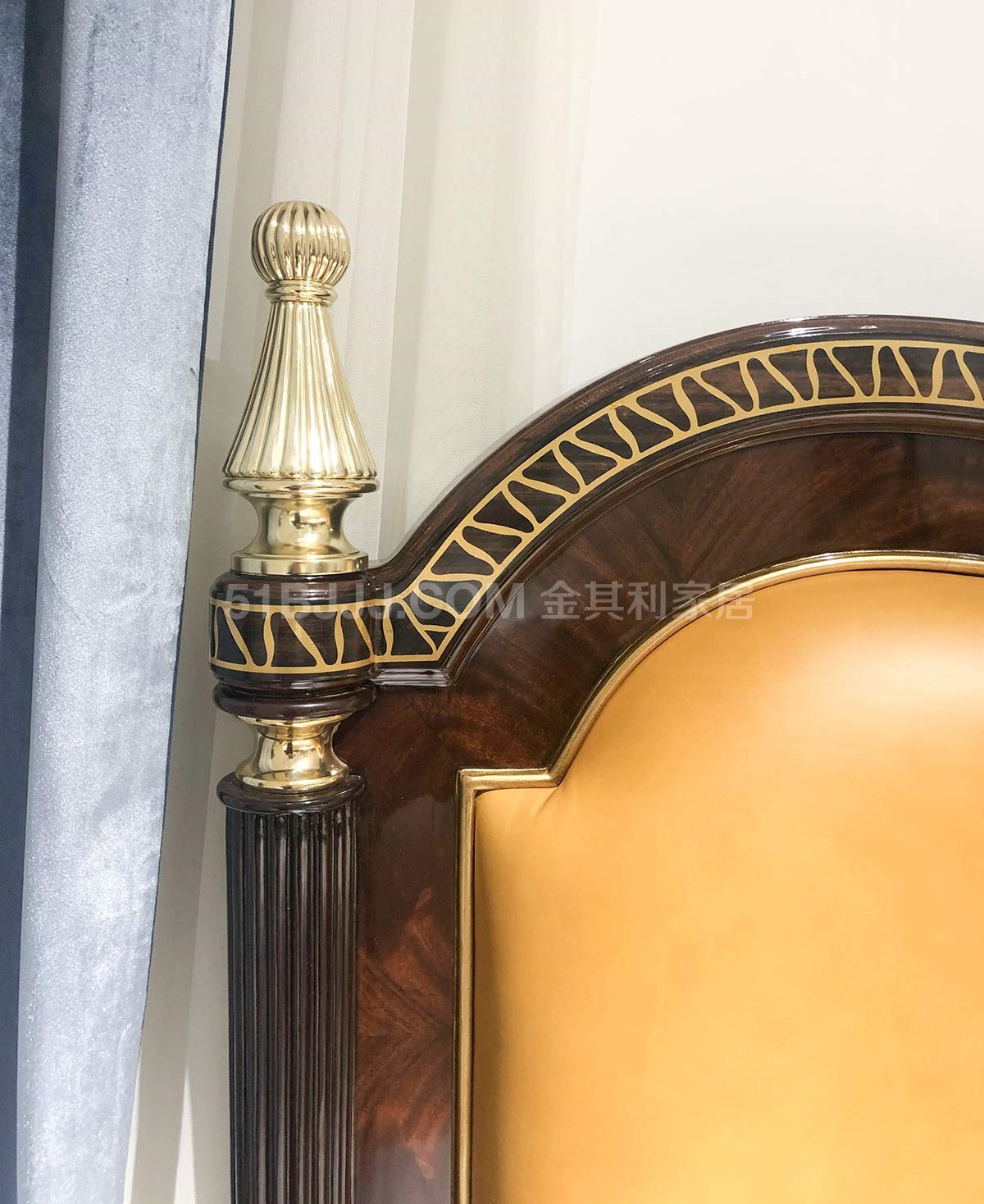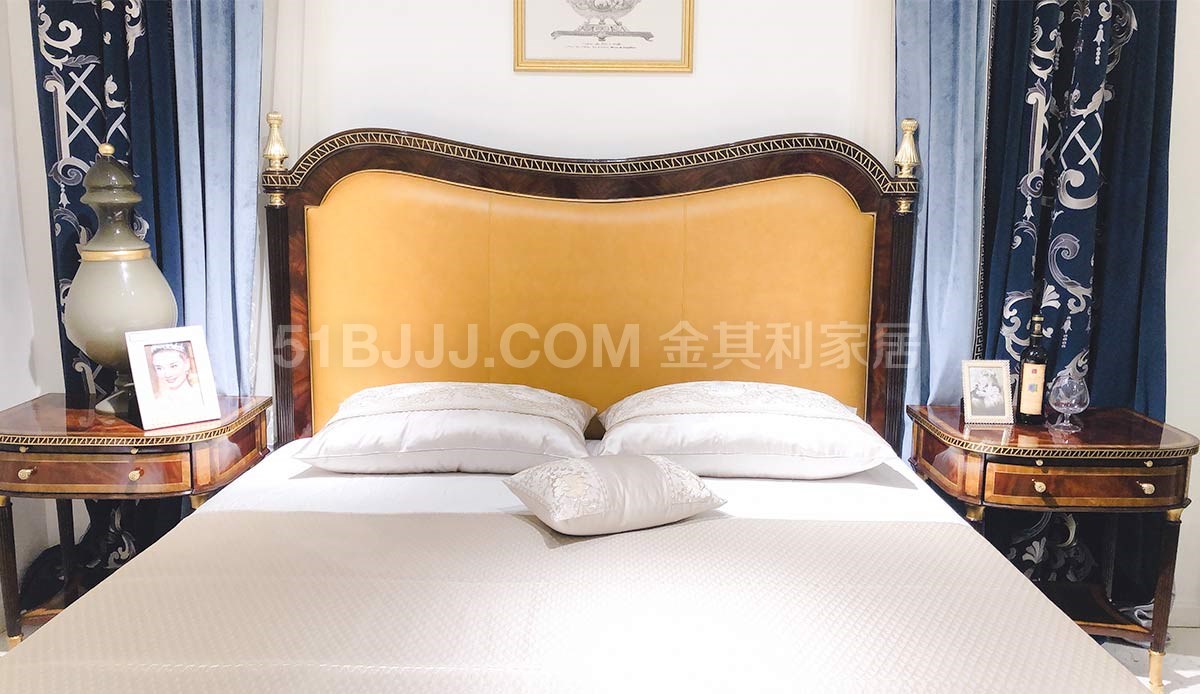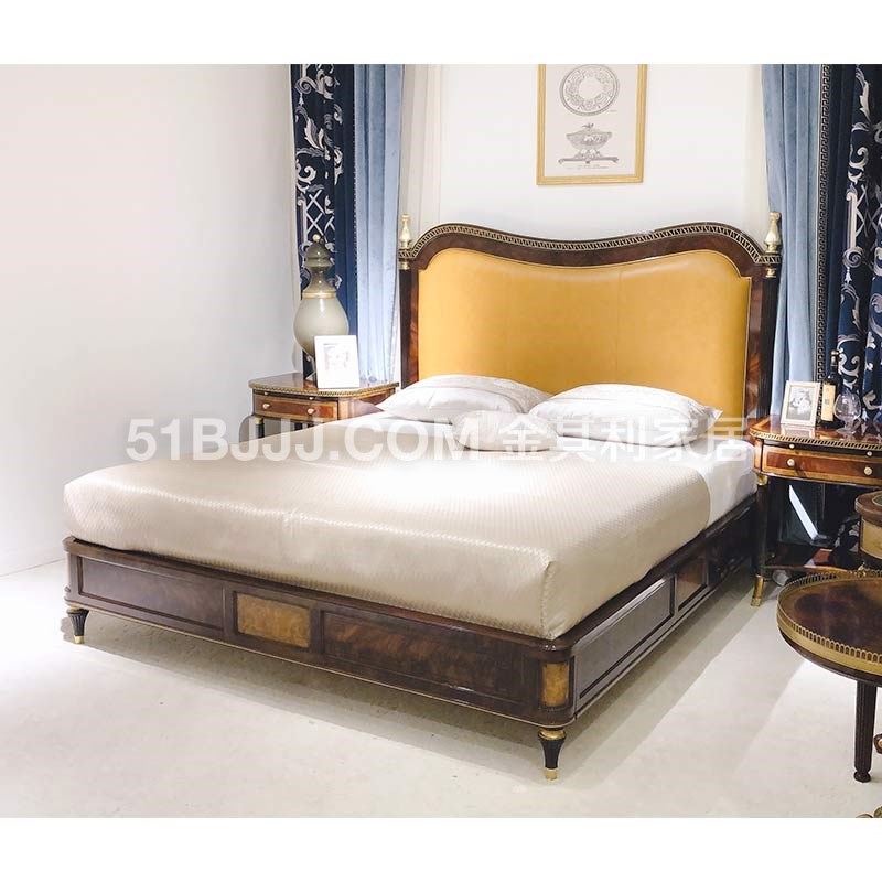 金其利家具亞歷山大進(jìn)口姜黃色頭層牛皮雙人床銅件